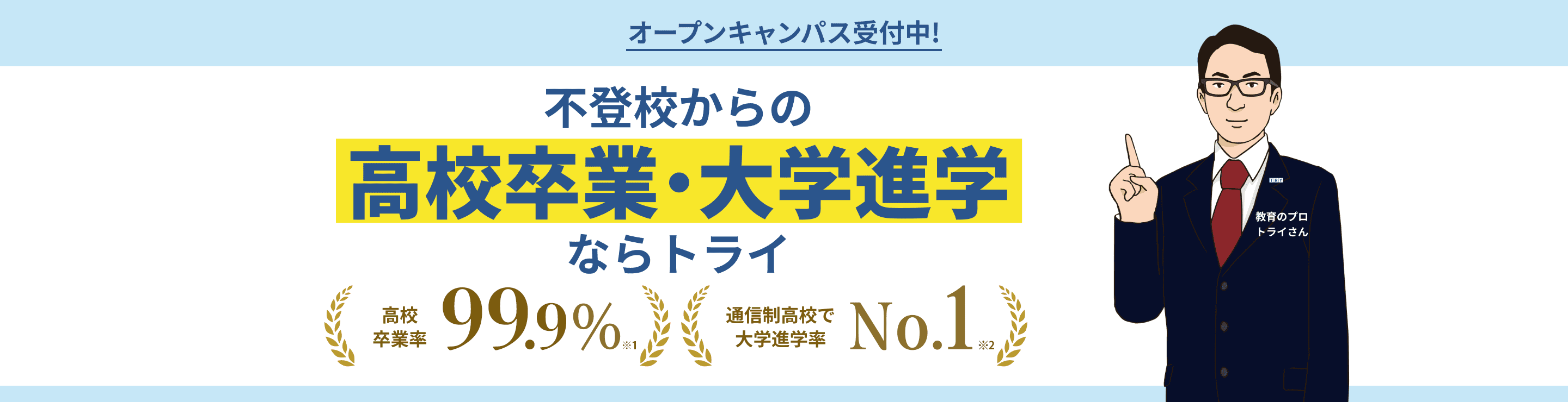 ※1:卒業対象者のうち、退学者を除いた割合。 2025/3トライグループ調べ ※2:大学進学率とは、進路決定者のうちの大学・短大・専門職大学に合格した者において。在籍生徒数3,500名以上の通信制高校・サポート校において進学率全国1位。2023/3/23 産経メディックス調べ。トライ式高等学院は通信制高校サポート校です。 ※3: 大学進学率とは、特進科所属の進路決定者のうち、大学・短大・専門職大学に合格した者において。2025年トライグループ調べ